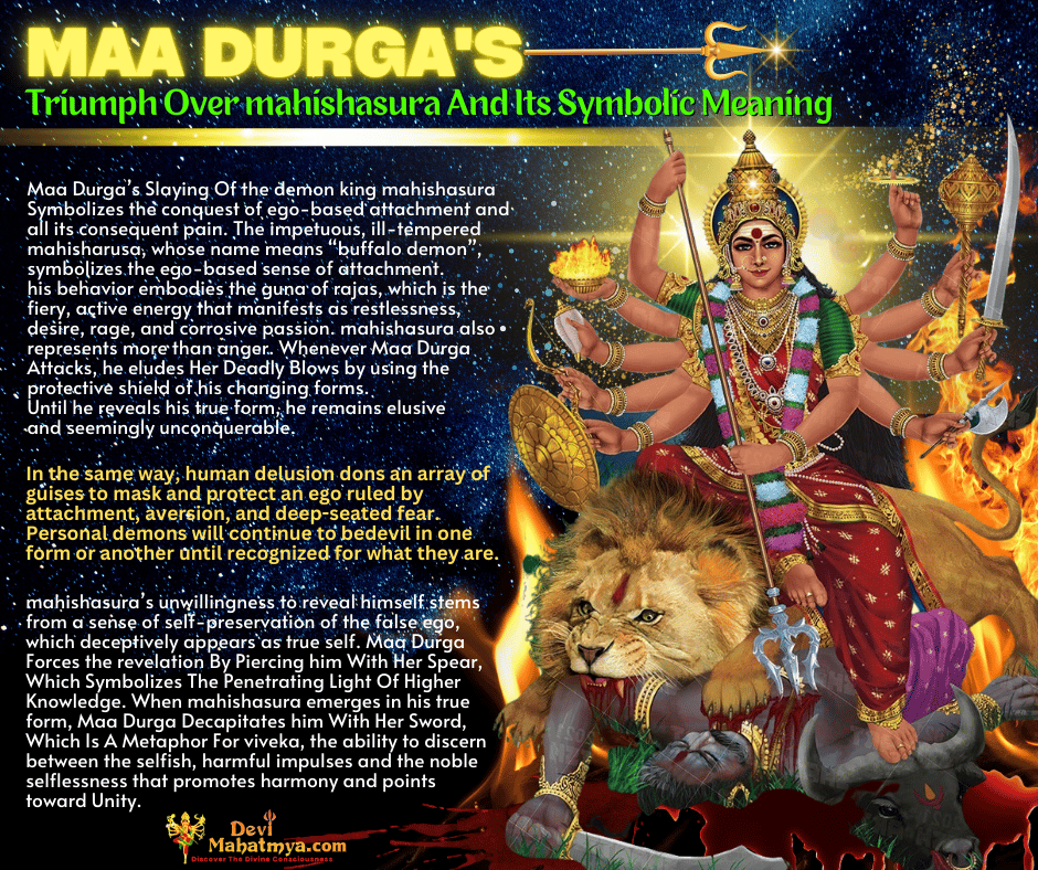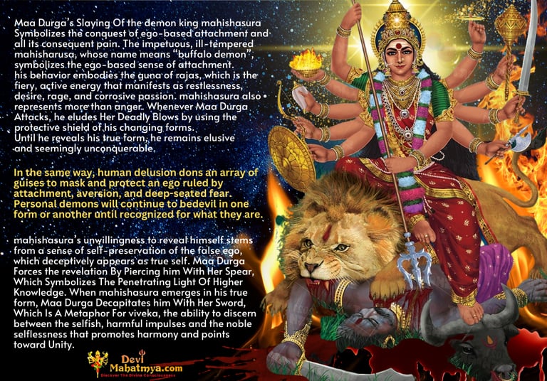 "Maa Durga’s Slaying Of the demon king Mahishasura symbolises the conquest of ego-based attachment and all its consequent pain. The impetuous, ill-tempered Mahisharusa, whose name means “buffalo demon”, symbolises the ego-based sense of attachment.