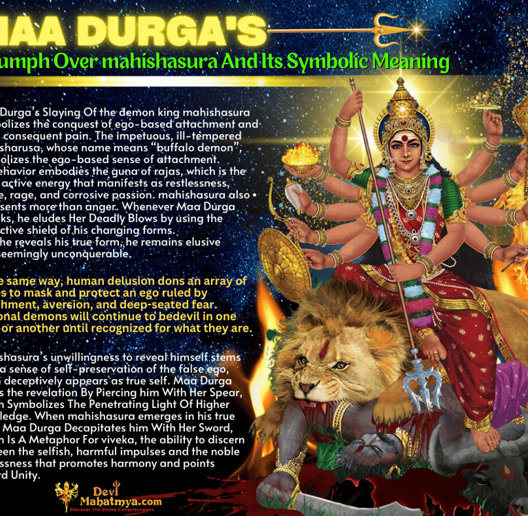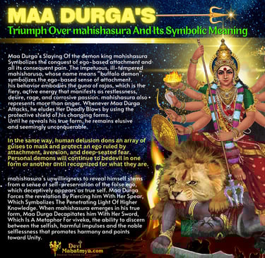 Mahishasura’s unwillingness to reveal himself stems from a sense of self-preservation of the false ego, which deceptively appears as true self. Maa Durga Forces the revelation By Piercing him With Her Spear, Which Symbolizes The Penetrating Light Of Higher Knowledge. When mahishasura emerges in his true form, Maa Durga Decapitates him With Her Sword, Which Is A Metaphor For 'Viveka', the ability to discern between the selfish, harmful impulses and the noble selflessness that promotes harmony and points toward Unity."